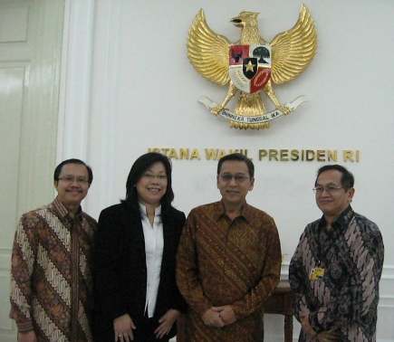 | From left: Mr. Doni Koesoema A, Mrs. Henny Rahayu, Mr. Boediono (Vice President of Indonesia), Mr. H.Witdarmono.